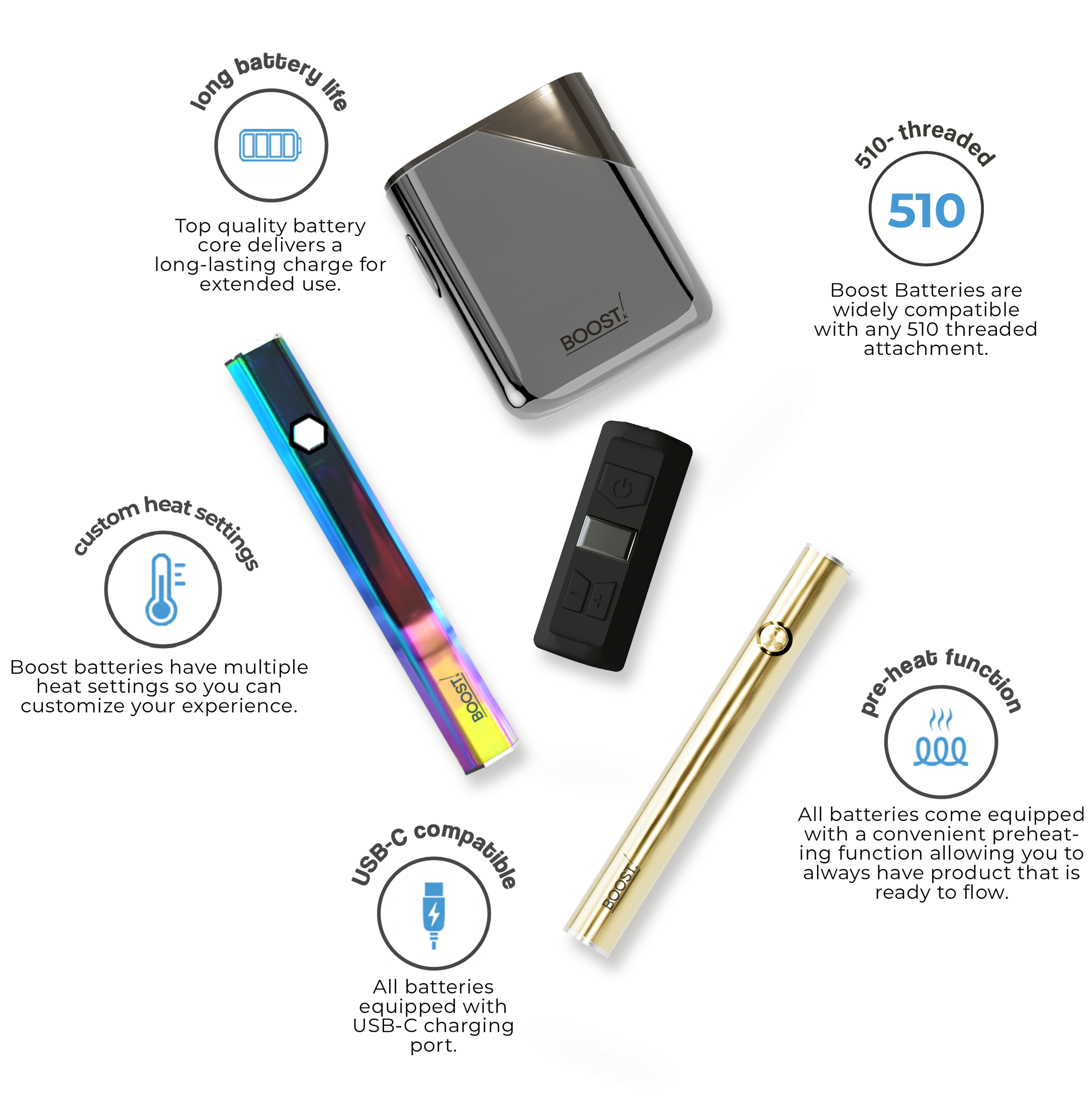 Boost Batteries are designed for optimal performance, compatibility, and unique style. Each 510 thread battery features adjustable voltage settings, customizable vapor production and enhanced battery life, Boost cart batteries are perfect for both beginners and experienced vapers alike.