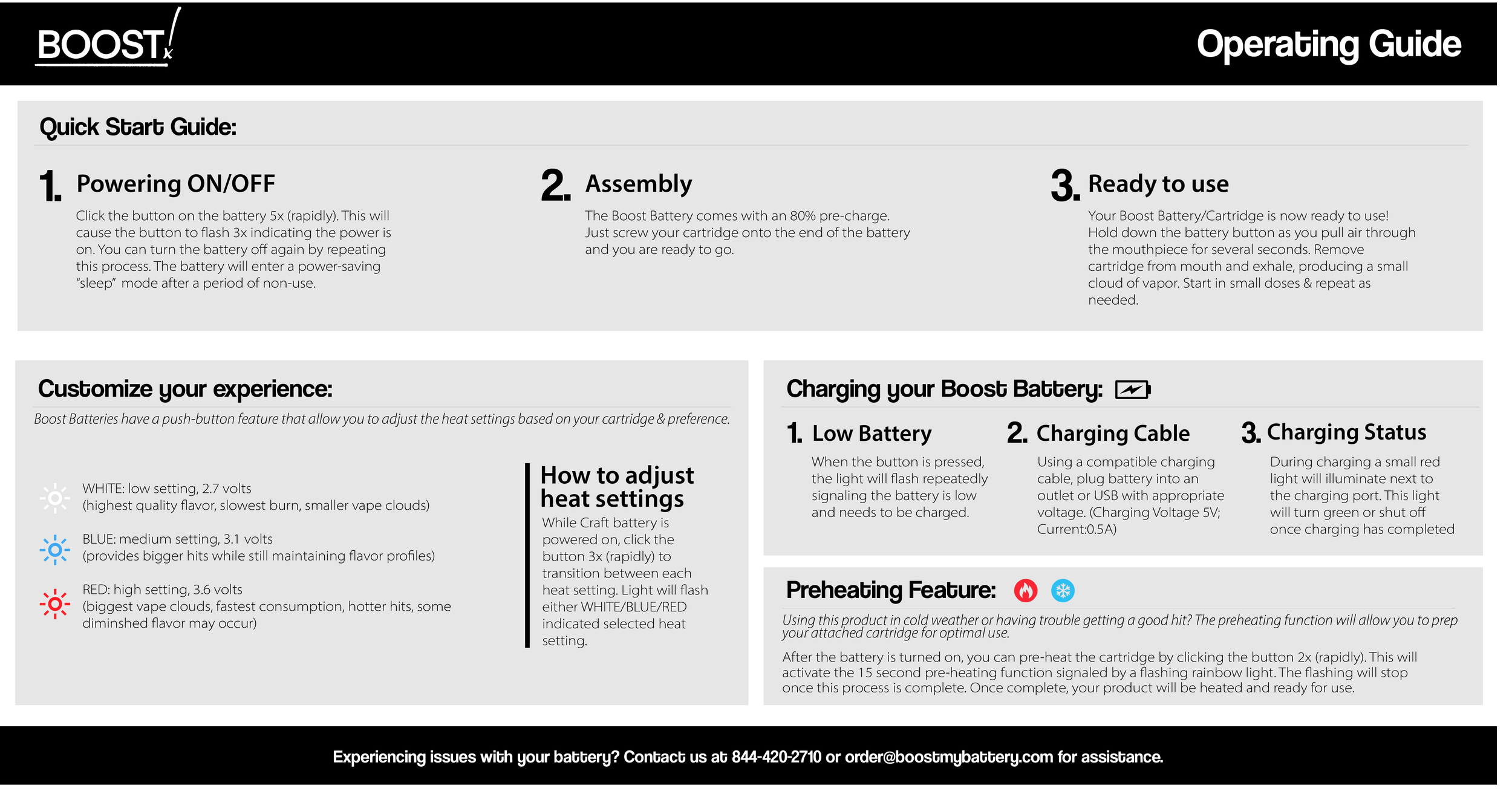 Ready to Use: Your Boost Battery/Cartridge is now ready to use! Hold down the battery button as you pull air through the mouthpiece for several seconds. Remove cartridge from mouth and exhale, producing a small cloud of vapor. Start in small doses & repeat as needed.